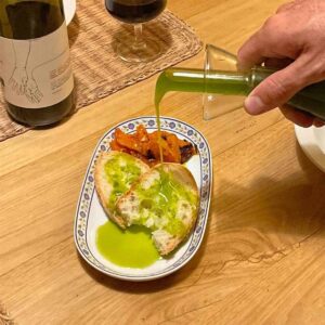 En crudo sobre ensaladas, pan con tomate, verduras y pescados. Perfecto para vinagretas (1 parte de ácido por 3 de aceite), mayonesa/alioli suaves y repostería salada como focaccia.