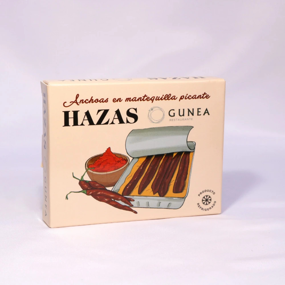Las Anchoas en Mantequilla Picante Hazas son una conserva gourmet refrigerada de alta gama, elaborada a partir de anchoas seleccionadas del Cantábrico, maduradas y limpiadas a mano, y presentadas en una mantequilla suavemente picante que potencia su sabor sin ocultar la pureza del pescado. Una receta exclusiva que combina intensidad, cremosidad y un picante elegante.