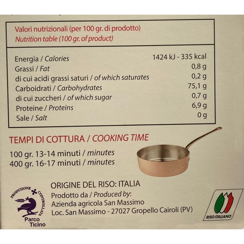El arroz Carnaroli Riserva San Massimo es una referencia excepcional dentro de los arroces italianos de alta gama. Cultivado en reservas naturales y madurado cuidadosamente, destaca por su grano largo, firme y rico en almidón, ideal para lograr risottos cremosos y perfectamente ligados.