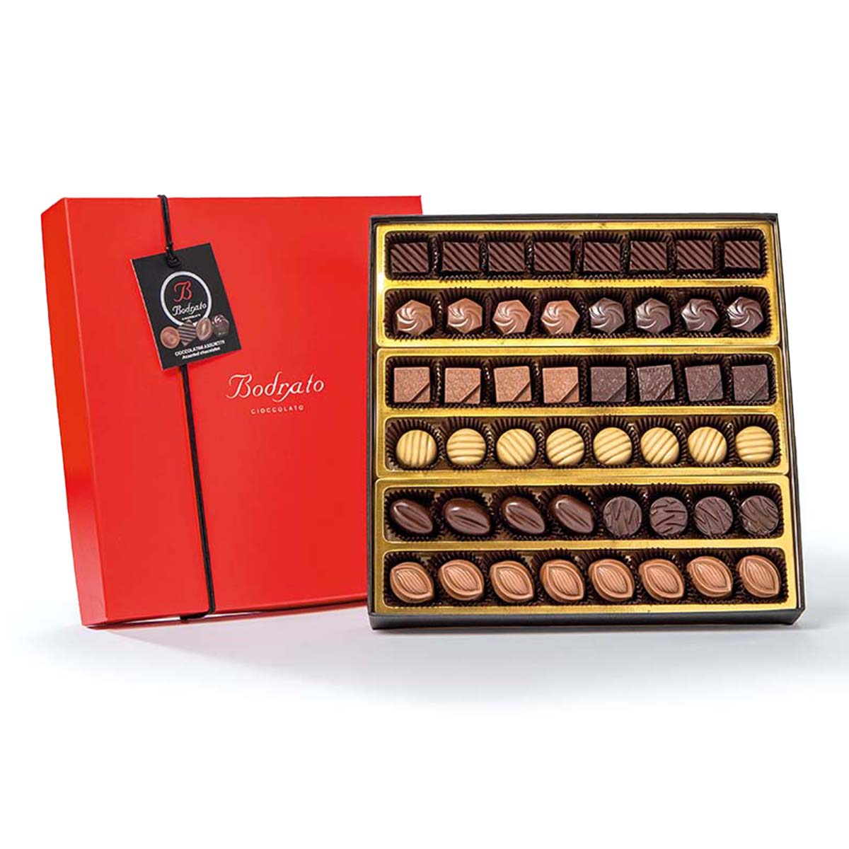 Bombones surtidos Bodrato caja roja grande 480g es la selección icónica de la casa piamontesa presentada en su envoltorio más reconocible. Esta bombonera grande reúne pralinés, trufas, giandujas y chocolates negro, con leche y blanco, ofreciendo una experiencia variada y elegante. Ideal para compartir, Bombones surtidos Bodrato caja roja grande 480g equilibra texturas cremosas y toques crujientes con el sello artesanal de Bodrato.
