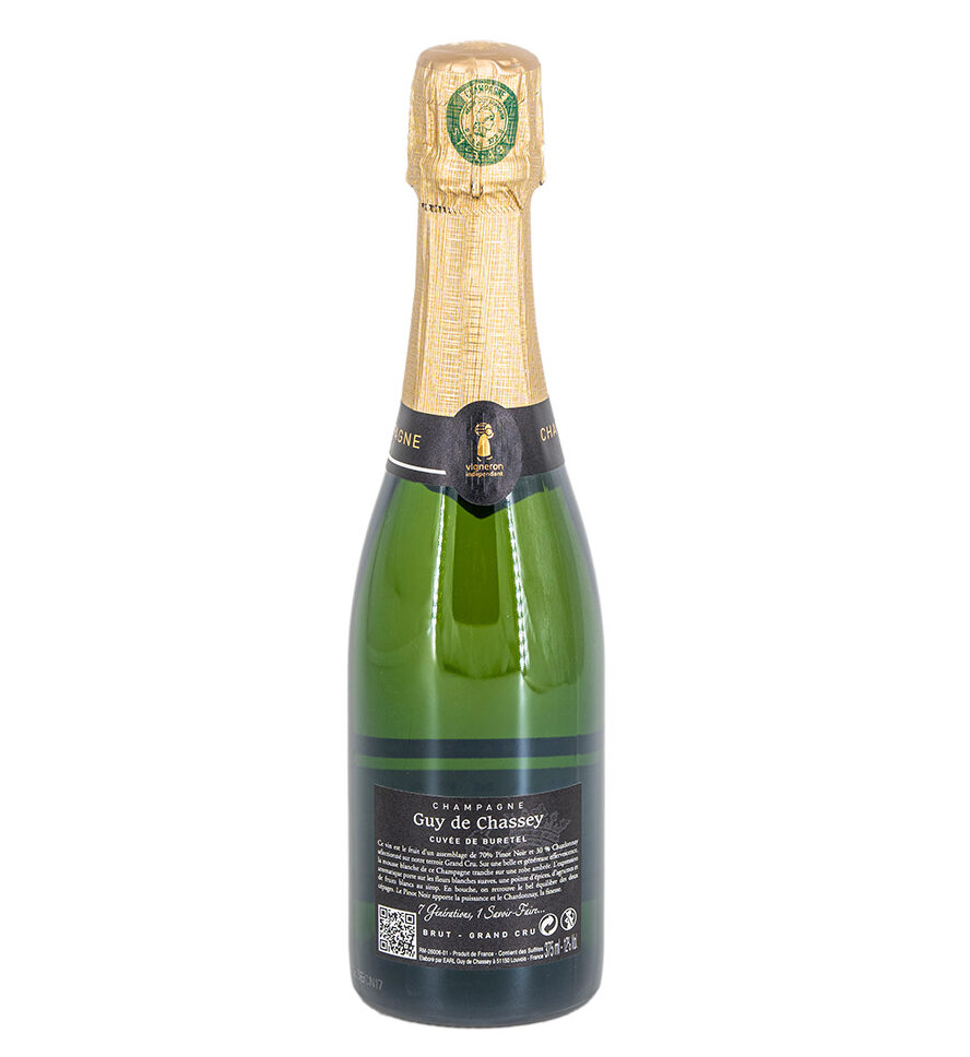 El Champagne Brut Cuvée de Buretel Guy de Chassey es una cuvée Grand Cru que expresa el estilo clásico y preciso de la maison en un formato media botella (37,5 cl), perfecto para disfrutar en pareja o en ocasiones especiales. Elaborado con uvas de viñedos Grand Cru, combina frescura, estructura y una burbuja fina y persistente.