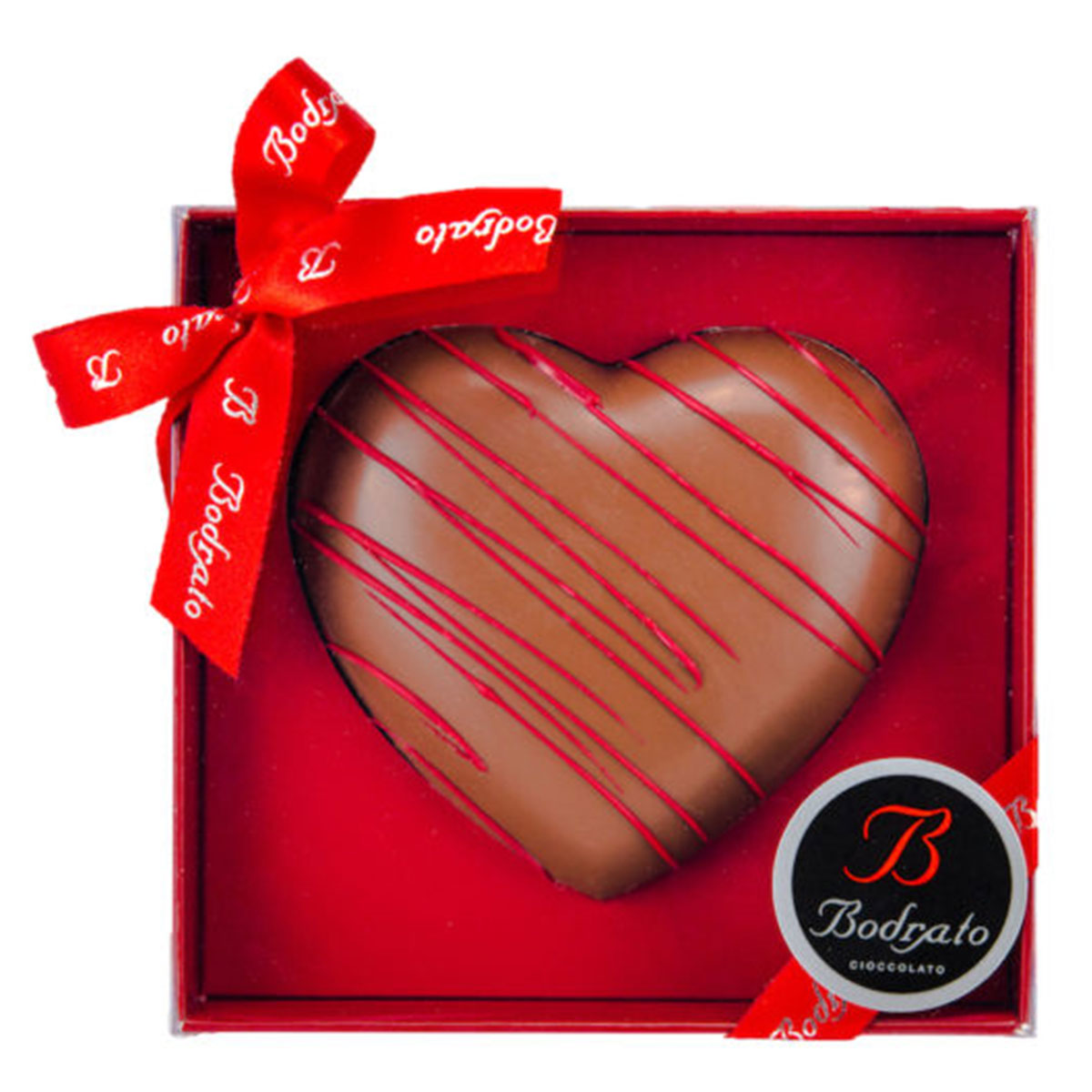Este corazón de chocolate con leche rayado Bodrato para San Valentín se elabora artesanalmente en el Piamonte con cacao seleccionado y leche de alta calidad, logrando una textura cremosa, suave y equilibrada, con un perfil redondo y elegante.