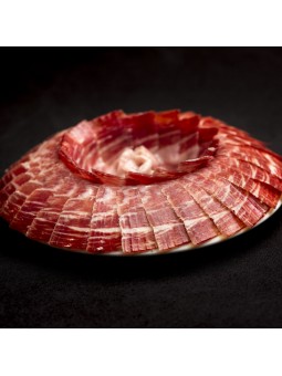 Procedente de cerdos 100 % ibéricos alimentados en montanera, cada sobre ha sido cortado a cuchillo para preservar intactas la textura, el aroma y la untuosidad del jamón.