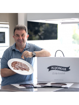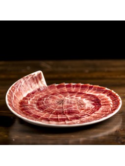 Procedente de cerdos ibéricos alimentados en montanera, este jamón ha sido loncheado a cuchillo plato a plato, garantizando máxima expresión de aroma, textura y sabor.