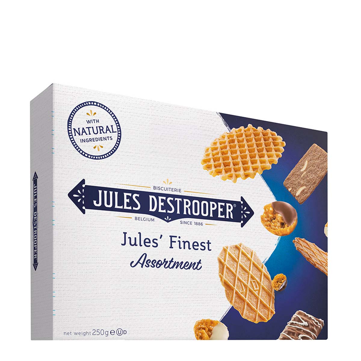 El surtido de galletas belgas variadas Jules Destrooper 250 g reúne las recetas más celebradas de la histórica casa belga (desde 1886). Gracias a su masa rica en mantequilla y a una cocción precisa, cada pieza resulta fina, dorada y muy crujiente. Además, viene en una caja práctica y elegante, perfecta para compartir o para obsequiar.