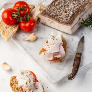 Gruesas mantas de grasa dorsal de cerdo pesado italiano se salan con cristales marinos de la Toscana y se aromatizan con ajo morado, romero, salvia, canela y granos de pimienta.