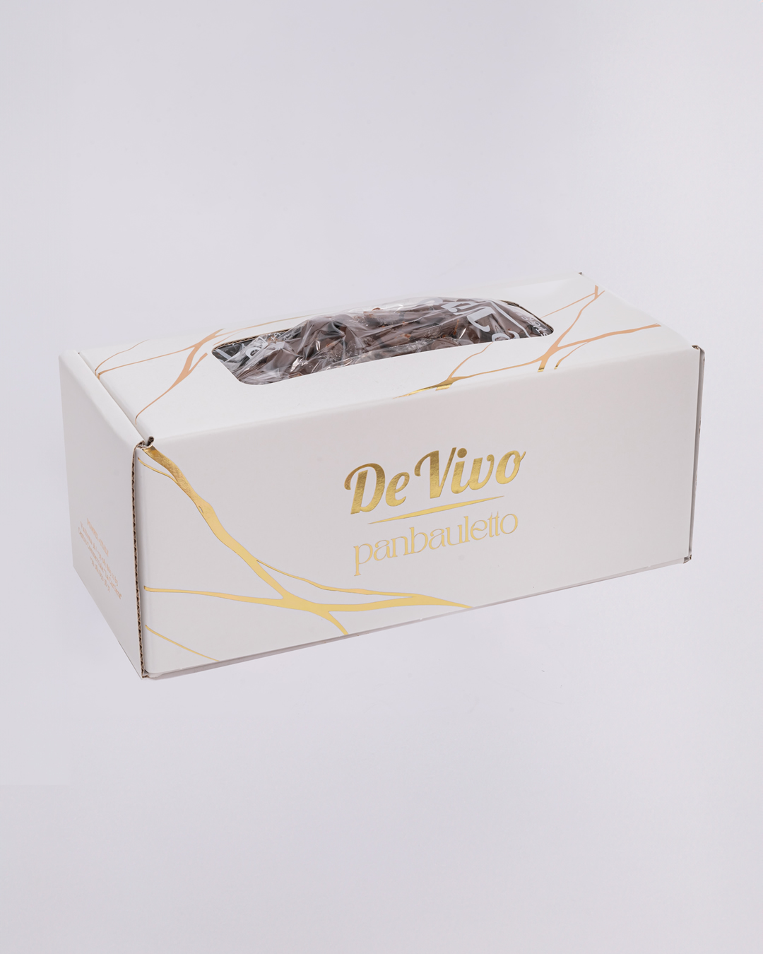 El PanBauletto Chocorhum De Vivo 400 g es un bizcocho artesanal italiano de textura suave y esponjosa, elaborado por la prestigiosa Pasticceria De Vivo de Pompei. Está relleno de una cremosa ganache de chocolate y delicadamente humedecido con ron, creando un equilibrio perfecto entre dulzor, intensidad de cacao y calidez aromática.