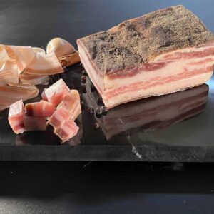 Panceta seleccionada de cerdos italianos se sala con granos de pimienta, clavo, canela, ajo y hierbas silvestres de los Alpes Apuanos.