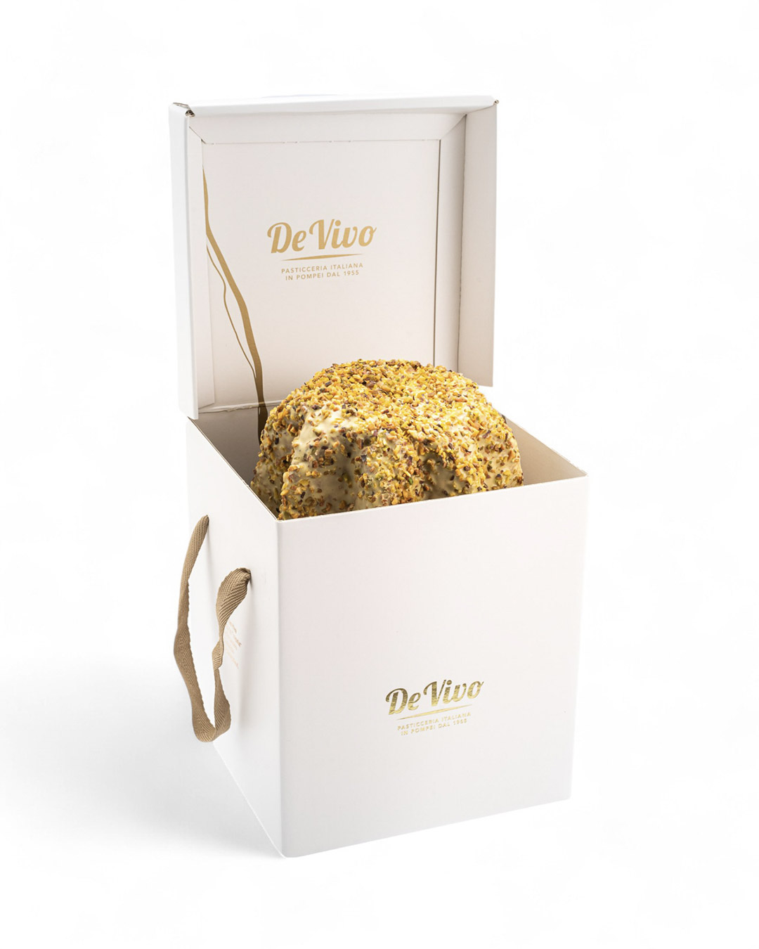 El Pandoro de Pistacchio Pasticceria De Vivo 1,2 kg es una obra maestra de la alta pastelería italiana, elaborada artesanalmente por la histórica pasticceria de Pompeya, activa desde 1955.