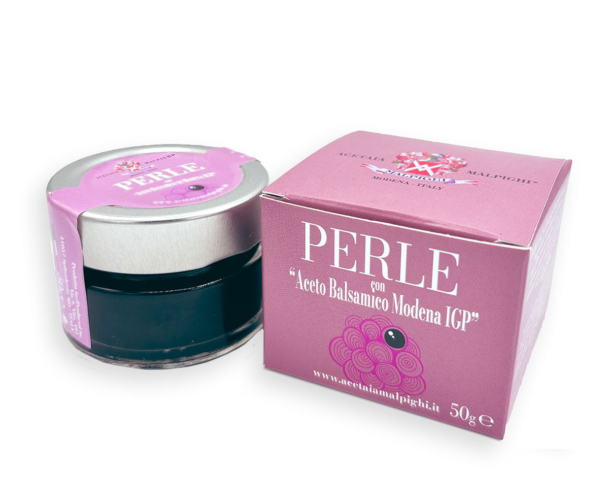 Las Perlas de Aceto Balsámico de Módena IGP Acetaia Malpighi 50g encapsulan en forma de esferas gourmet el auténtico sabor del aceto balsámico tradicional.