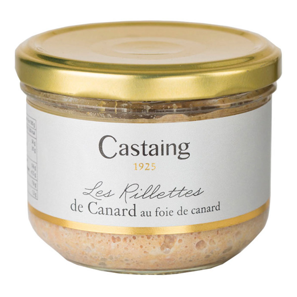El Rillettes de Pato con Foie de Pato Castaing 180 g es una especialidad tradicional del suroeste francés que combina la jugosidad de la carne de pato confitada con la untuosidad del foie gras.