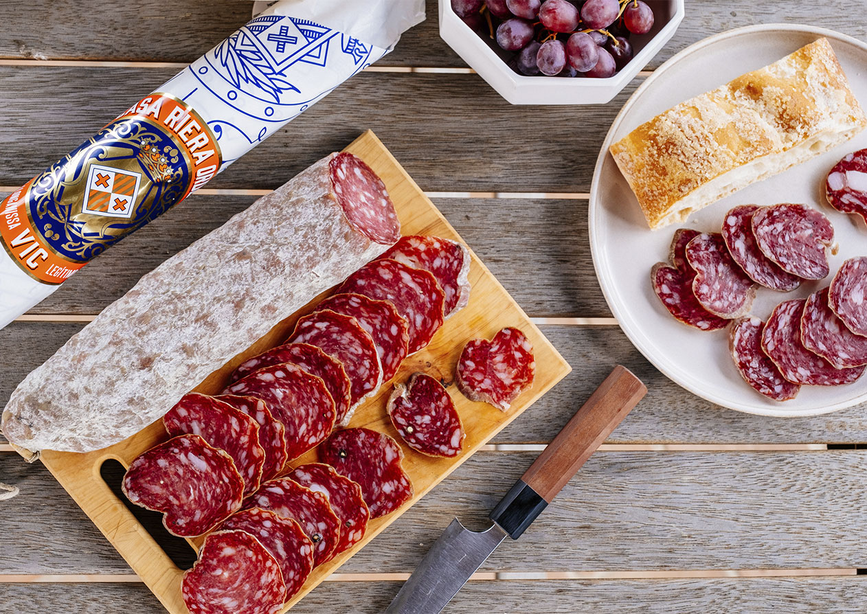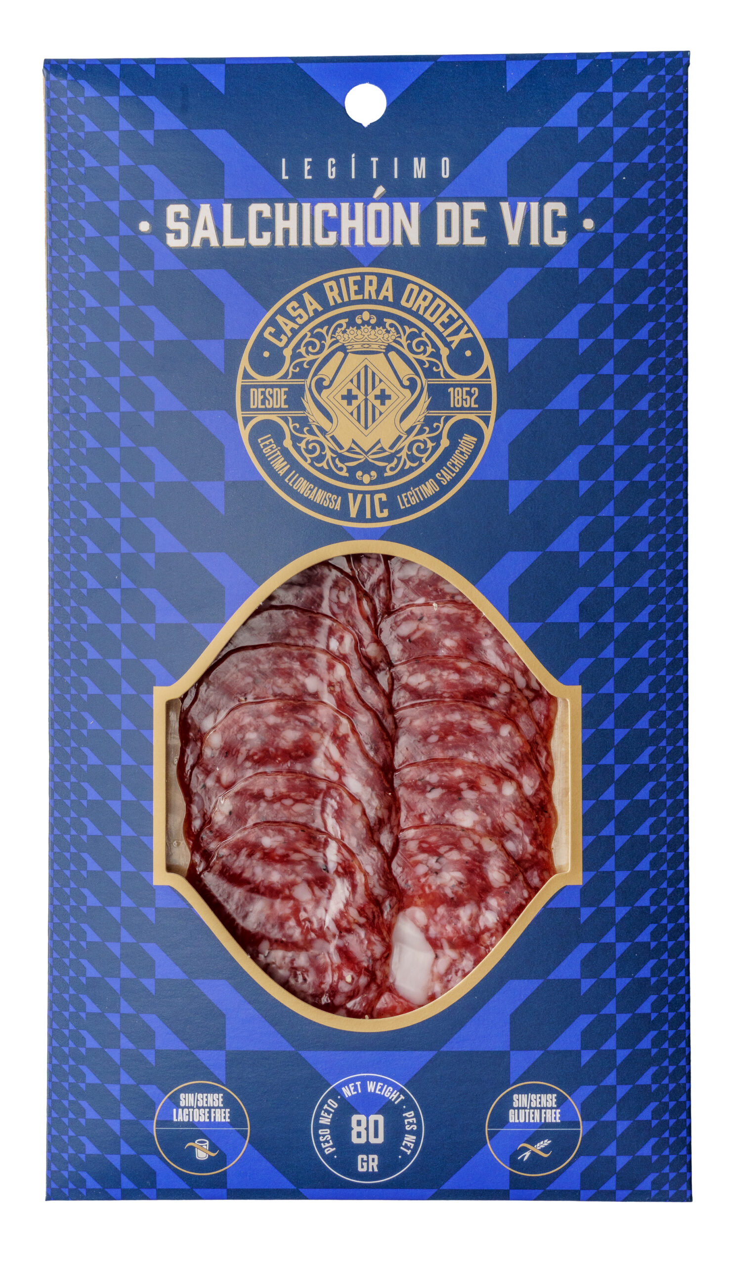 El Salchichón de Vic loncheado Casa Riera Ordeix es una de las referencias más emblemáticas de la charcutería catalana. Elaborado siguiendo la receta tradicional de Vic, destaca por su equilibrio entre magro y grasa, curación lenta y un perfil aromático limpio, suave y persistente.