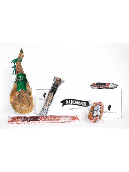Incluye una paleta de cebo de campo ibérica 50–75 % raza ibérica, acompañada de chorizo, salchichón, morcón extra y lomito ibéricos, conformando una selección equilibrada y muy versátil.
