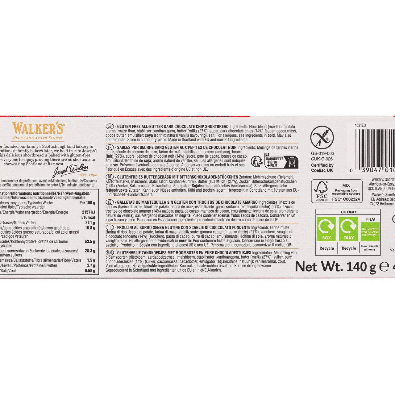 Las Shortbread galletas de mantequilla con chips de chocolate Walkers sin gluten combinan la receta clásica escocesa con una formulación apta para personas celíacas, manteniendo la textura friable, el sabor intenso a mantequilla y el equilibrio justo de chips de chocolate. Elaboradas por Walkers, referencia histórica en shortbread artesanal, ofrecen una experiencia auténtica sin renunciar a la calidad ni al placer.