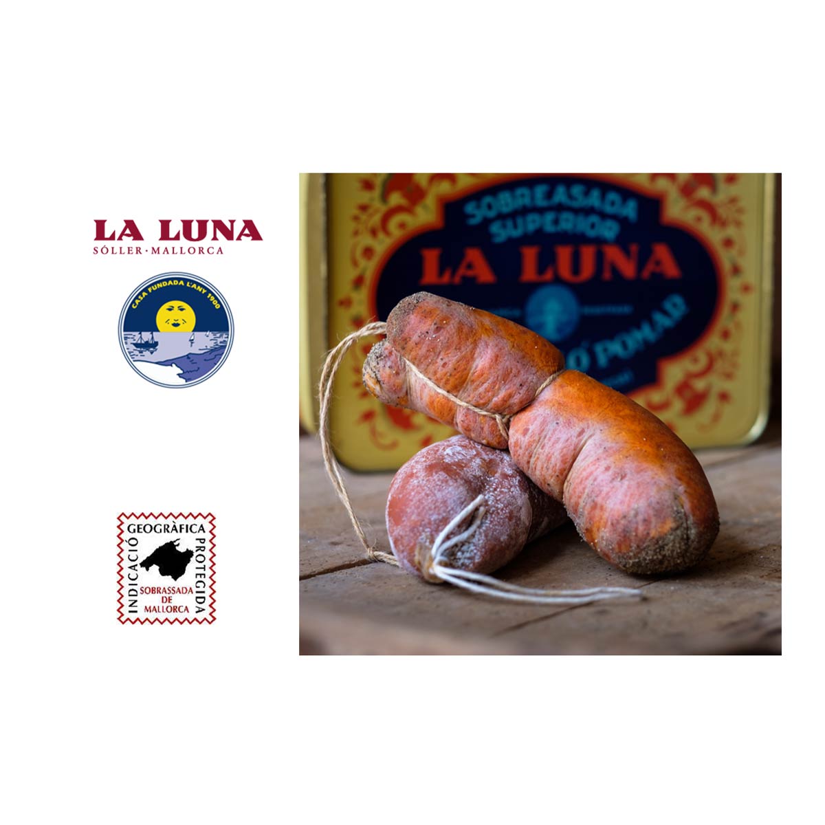 La Sobrassada Dulce Superior IGP La Luna 300 g es una sobrasada mallorquina auténtica, elaborada según la Indicación Geográfica Protegida (IGP Sobrassada de Mallorca), con carne de cerdo seleccionada, pimentón dulce de alta calidad y una curación lenta que garantiza textura untuosa y sabor equilibrado.