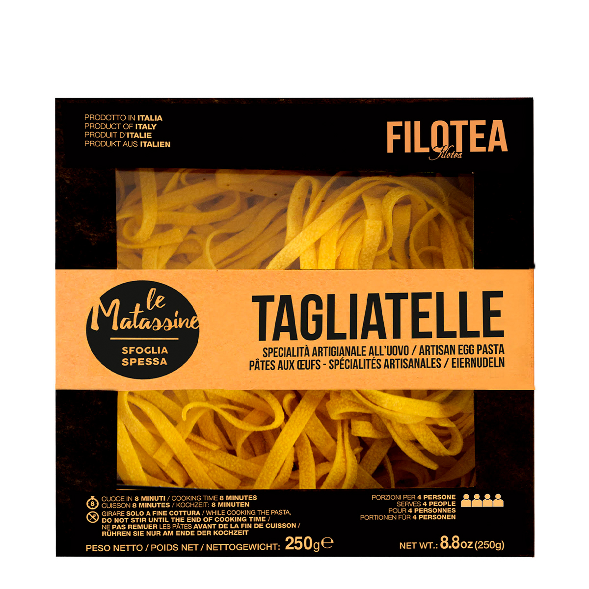 Las tagliatelle al huevo Filotea son una pasta italiana artesanal de referencia, elaborada con sémola seleccionada y huevos frescos mediante un proceso tradicional de laminado fino y secado lento. El resultado es una pasta sedosa, elástica y con gran capacidad de absorción, que realza cualquier salsa con elegancia y precisión.