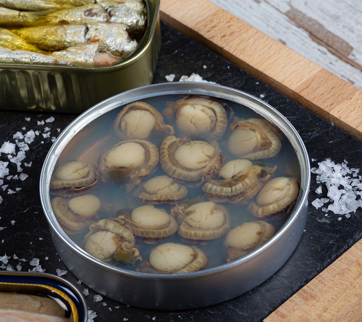 Las zamburiñas en conserva son mariscos seleccionados por su calidad, preparados y envasados para mantener su sabor y textura.